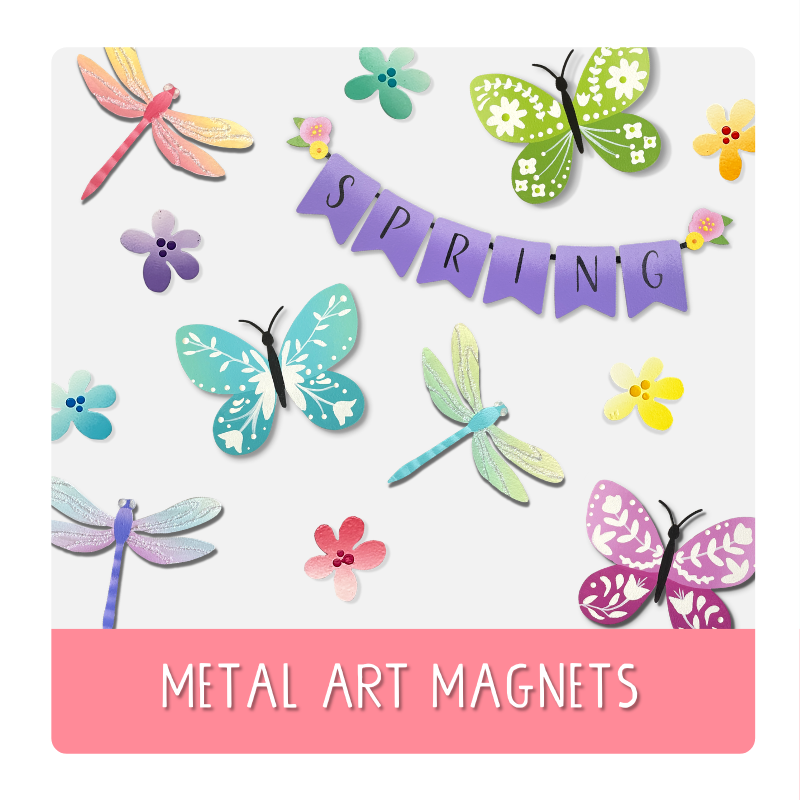 Brighten your life with with Roeda's hand-painted metal art magnets! Decorate any of our bases with the cutest magnets to fit any season, holiday, and occasion.